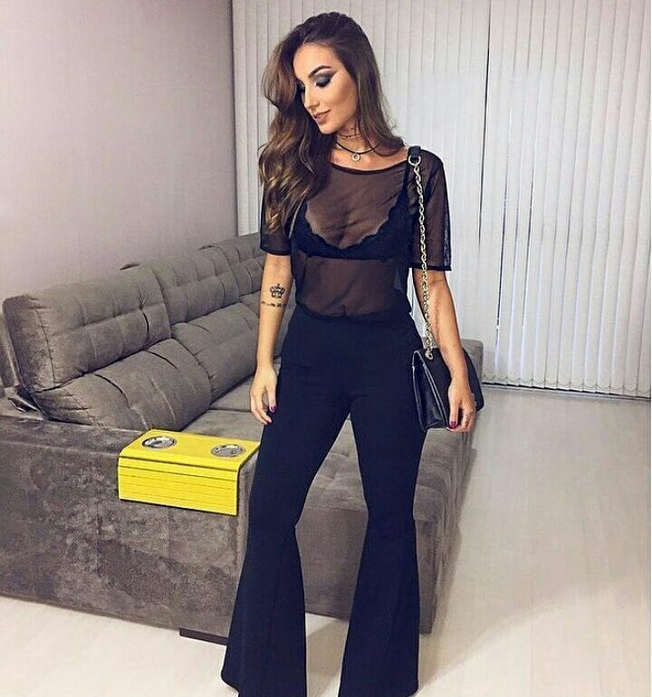 A calça flare já tem um estilo mais sensual que marca a silhueta feminina, mas para explorar ainda mais essa sensualidade, aposte nas calças de couro ou bandage combinadas com cropped, transparência e o famoso decote em V. Abuse também dos acessórios como bolsa de corrente e cinto para valorizar ainda mais a cintura.