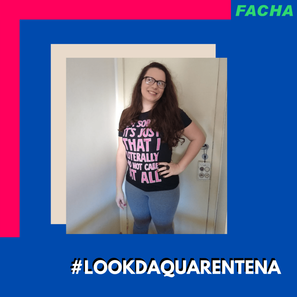 A Clara optou pela praticidade no #LookDaQuarentena: calça legging e camiseta. A estudante tem passado as manhãs em frente ao computador trabalhando e esse look confortável poderia facilmente ser usado em uma reunião online de emergência, por exemplo, já que a empresa é flexível quanto às vestimentas dos funcionários. Arrasou!
