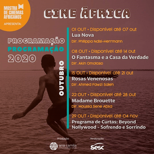 Os filmes disponíveis na programação nessa edição do Cine África possuem, em sua maioria, até no máximo 5 anos de produção, a fim de valorizar a contemporaneidade do cinema africano atual. O projeto conta com filmes de destaque de Burkina Faso, Camarões, Egito, Etiópia, Nigéria, Quênia, Senegal e Sudão. O mês de outubro está com 5 produções em seu catálogo, além de uma conversa online com uma das curadoras do evento e outros dois convidados especiais. Já foram exibidos, até agora, o documentário “Lua Nova” de Philippa Ndisi-Hermann (Quênia), o drama “O Fantasma e a Casa da Verdade” de Akin Omotoso (Nigéria) e o também drama “Rosas Venenosas” de Fawzi Saleh (Egito). Este último ainda está disponível para exibição até o dia 22/10 na plataforma online do Sesc Digital, junto com uma entrevista com o diretor Fawzi Saleh. O trailer oficial do filme pode ser encontrado através deste link.