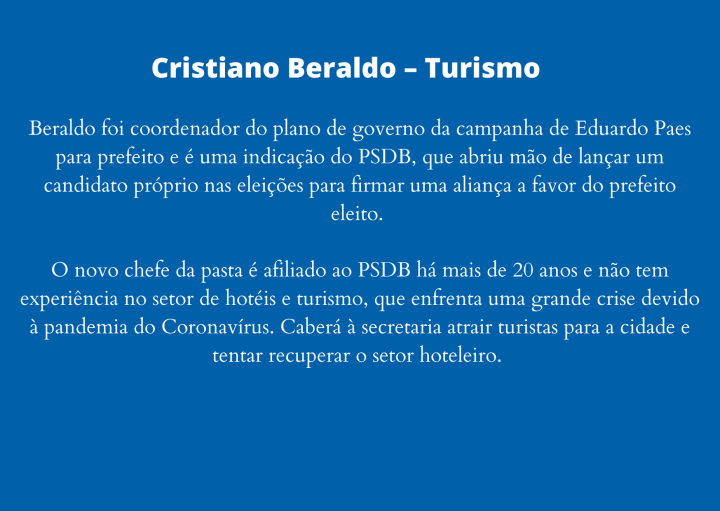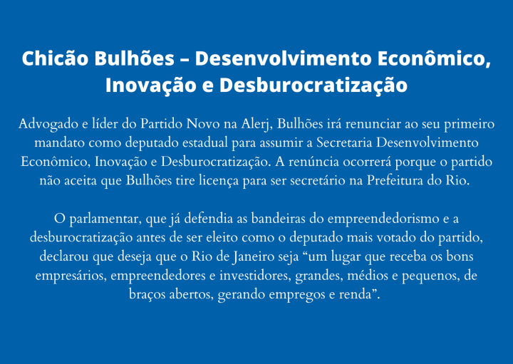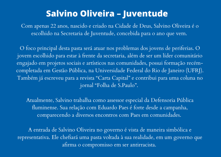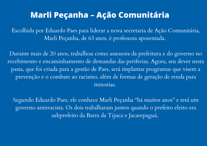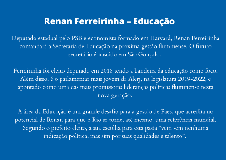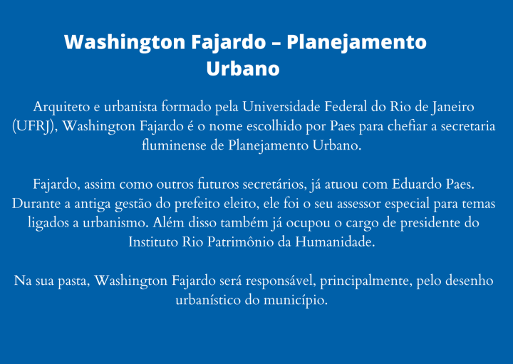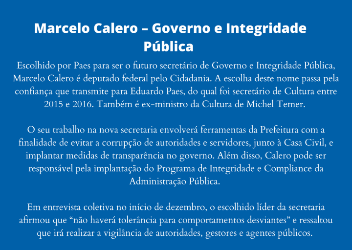 O prefeito eleito do Rio de Janeiro, Eduardo Paes (DEM), dará início ao seu terceiro mandato em 01 de Janeiro de 2021 e já concluiu a escolha dos 23 nomes que serão responsáveis pela gestão das secretarias de governo. A nova gestão possui oito secretarias a mais do que na prefeitura atual.