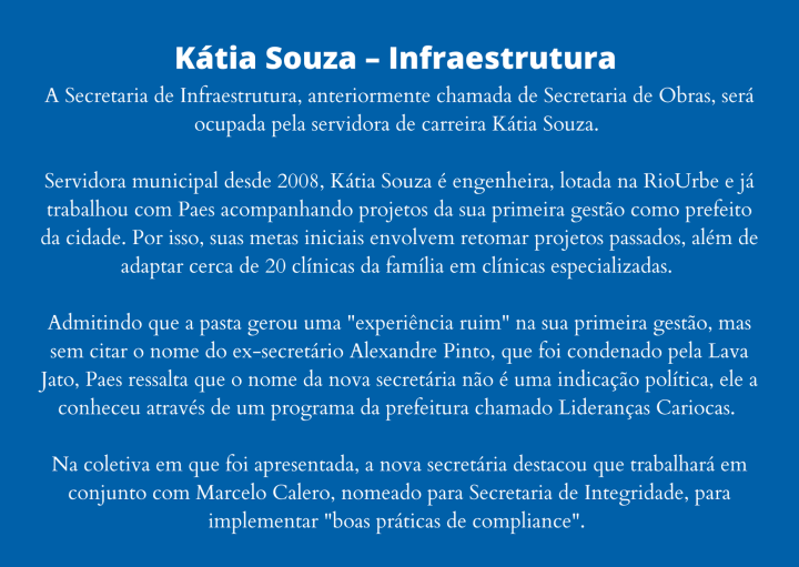 A montagem do quadro possui nomes técnicos, indicações de aliados e alguns dos escolhidos já fizeram parte dos governos anteriores de Paes. Desta vez, ele também investiu em nomes jovens, mas muito conhecidos no cenário político, e nomeou seis mulheres para liderar pastas. Eduardo Paes já havia declarado que em seu novo governo iria “trabalhar por um governo antirracista” e lembrou que em seus primeiros governos não havia negros entre os escolhidos para o primeiro escalão.