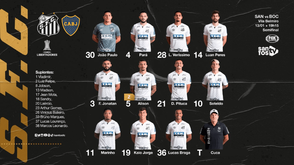 O Santos, do técnico Cuca, veio a campo no esquema de jogo 4-3-3, com Marinho e Lucas Braga nas pontas, Kaio Jorge fazendo a papel de centro avante e Soteldo responsável por municiar o trio de atacantes. Do lado argentino, Miguel Ángel Russo optou pelo 4-2-2, com Tévez e Soldano formando a dupla de atacantes, enquanto Eduardo Salvio e Villa ora atuavam como meias mais centrais, ora jogando mais pelos lados. O desfalque mais importante foi a ausência do jovem goleiro Jhon Victor, vetado pelo departamento médico santista devido a contaminação por Covid-19. Para seu lugar, Cuca confirmou o retorno de João Paulo, titular e melhor jogador em campo na vitória do time por 1 a 0 sobre o São Paulo, na rodada passada do Campeonato Brasileiro.