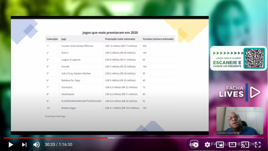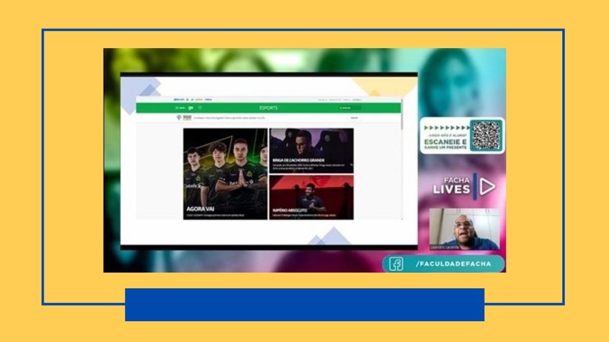 Visando abrir os nossos olhos para novas oportunidades de mercado, o coordenador Leandro Lacerda trouxe temas importantes para serem debatidos no segundo dia do Facha Lives, nesta terça (02). Nos primeiros 45 minutos do 1º tempo, Leandro falou sobre os eSports e como os profissionais de jornalismo que atuam com esporte estão lidando com a inclusão do entretenimento acompanhado à informação.