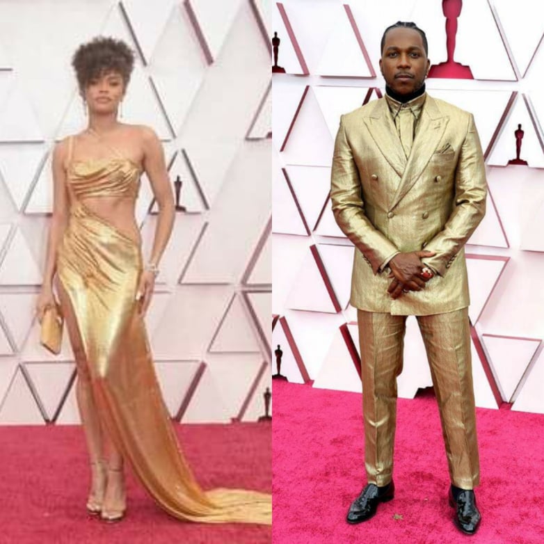 Além de Carey, Andra Day ousou ao usar um vestido com fendas, recortes e justo. Todo material dessa peça é de metal, o que o torna único, e foi produzido por Vera Wang para o Red Carpet. Os homens também tiveram uma ruptura de cores, e o dourado esteve presente no terno do indicado ao prêmio de Ator Coadjuvante – por Uma Noite em Miami – Leslie Odom Jr.