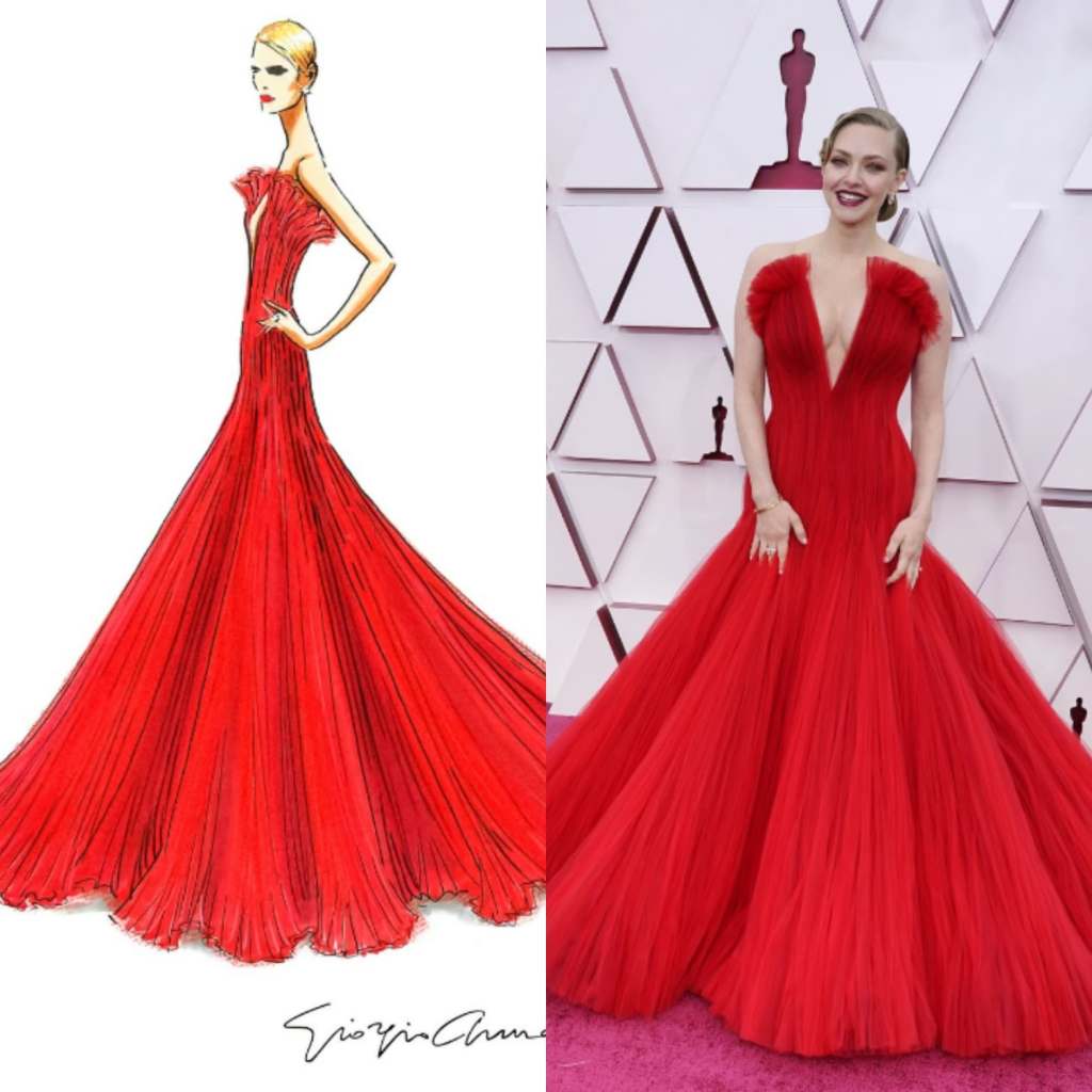 Outro look marcante em vermelho foi de Amanda Seyfried, indicada para a categoria de Melhor Atriz Coadjuvante. Seu vestido desenhado pelo estilista Giorgio Armani, também não continha alças e deixava transparecer leveza, em decorrência do tule e a classe no melhor estilo Hollywood. As inspirações foram as pétalas de flores e o traço de confiança e sensualidade da atriz, refletido pela cintura marcada e o decote.