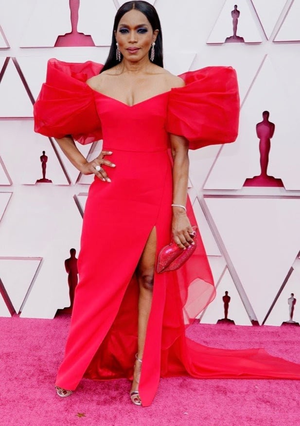 Angela Bassett fez sua entrada para a apresentação vestindo mangas bufantes e drapeadas de organzas, além da fenda e cauda longa personalizada por Alberta Ferretti. A atriz apostou no penteado minimalista e acessórios com pedras vermelhas que davam continuidade aos tons.