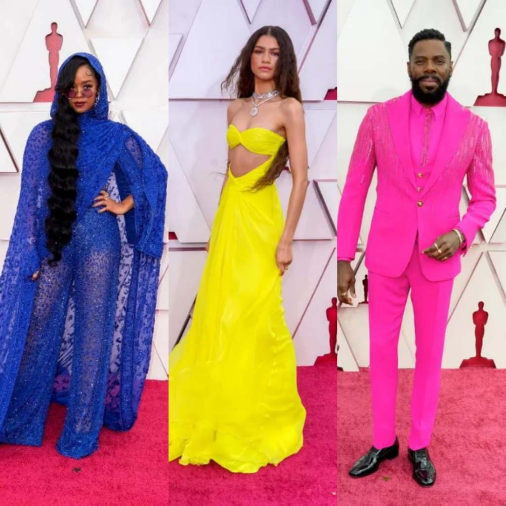 Cores vibrantes também vieram com força no tapete vermelho, desde o rosa pink ao amarelo neon, muitos artistas ousaram na escolha dos tons coloridos. Vamos começar pela cantora H.E.R, ganhadora do Oscar de melhor canção original, que escolheu um belo macacão bordado nos tons azul e roxo que foi assinado pelo designer Peter Dundas. O look foi inspirado no figurino que o cantor Prince usou no mesmo evento em 1985.