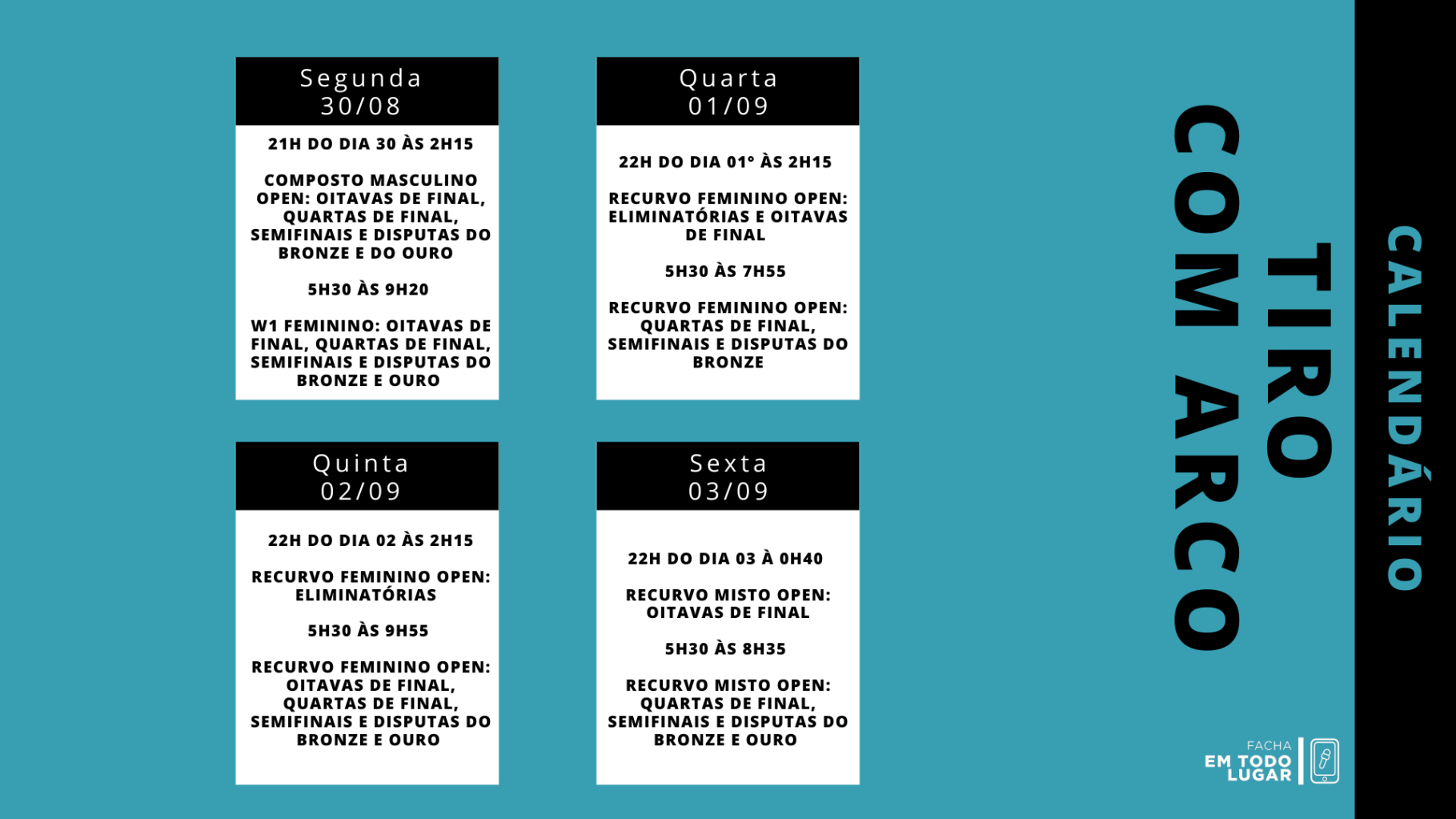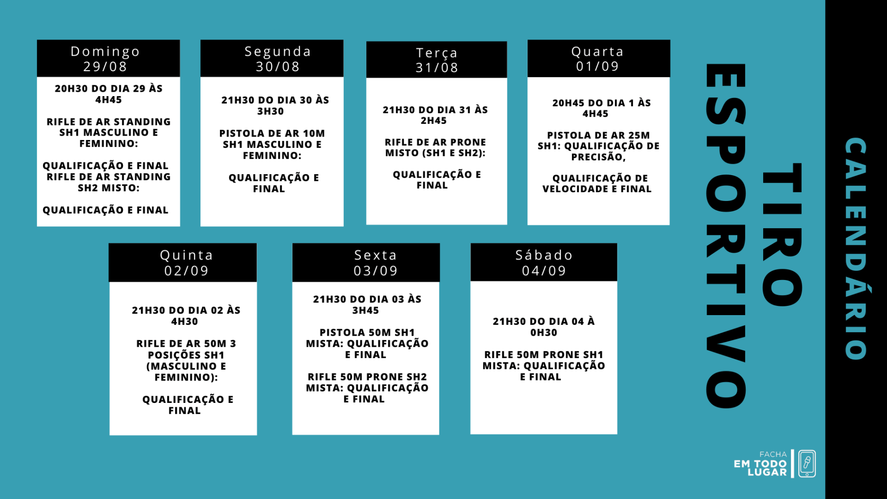 Todas as provas serão realizadas no Asaka Shooting Range e teremos entrega de medalha em todos os dias de competição. Serão 13 ao todo. Confirma a programação da modalidade: