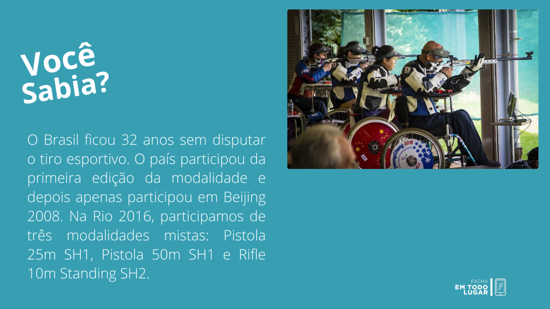 Um dos esportes mais tradicionais da história dos Jogos Olímpicos também está na Paralimpíada. O tiro esportivo está na programação desde Toronto 1976 e hoje é disputado em provas masculina, feminina e mistas. As provas são com pistolas e carabinas de ar e podem ser feitas em três posições: em pé, deitada ou ajoelhada e nesta edição serão 13 provas em 7 dias de competição. É um esporte que o Brasil não tem tradição, mas que tem um brasileiro lutando para fazer história na modalidade: Alexandre Galgani que estará na prova de rifle de ar 10m misto. As provas mistas nesta modalidade são com atletas homens e mulheres competindo.