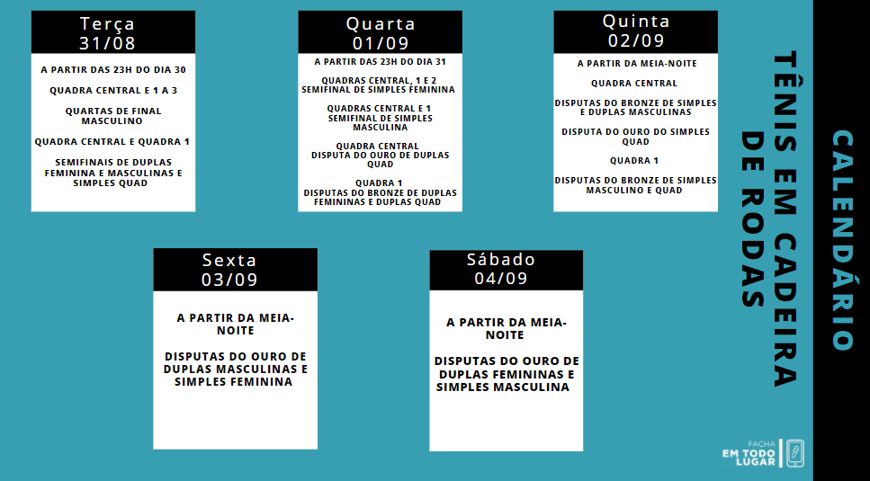 Todas as partidas serão realizadas no Tokyo Metropolitan Gymnasium e são divididas em dois momentos. A primeira parte será de torneios individuais. Em seguida, os torneios de equipes. São 31 medalhas distribuídas nos dias finais destes blocos que totalizam 10 dias de competição. Veja a programação: