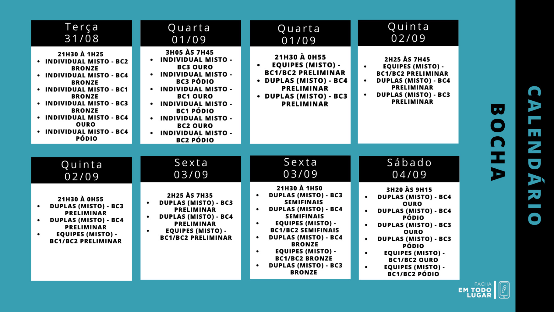 A bocha estreará nos Jogos Paralímpicos no dia 27 de agosto a partir das 21h30, horário de Brasília, e vai até o dia 4 de setembro. Os jogos serão disputados na Arena Ariake, em Tóquio.