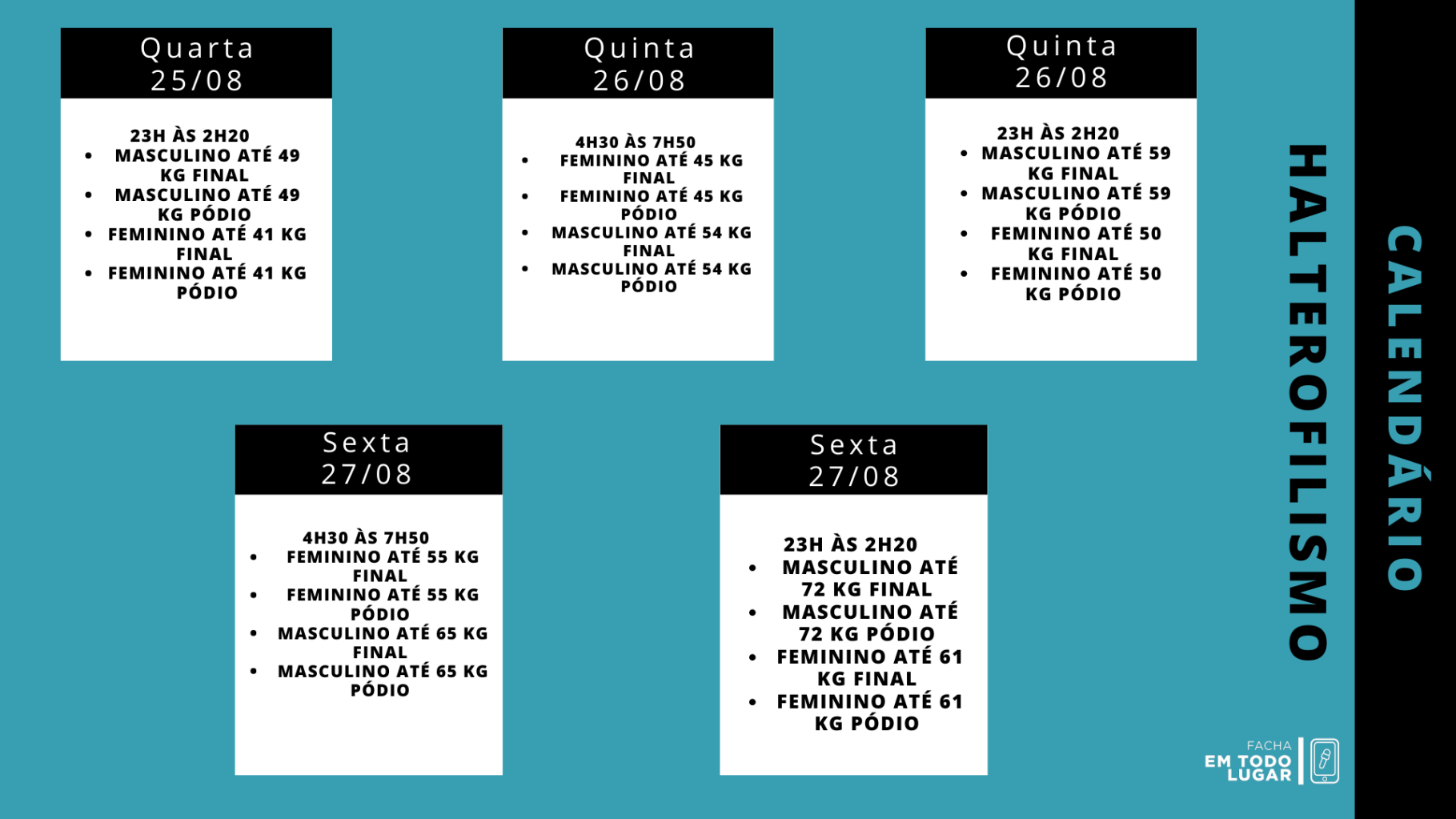 O halterofilismo estreará nos Jogos Paralímpicos no dia 25 de agosto a partir das 23h, no horário de Brasília, e vai até o dia 30 do mesmo mês. As disputas acontecerão no Fórum Internacional de Tóquio.