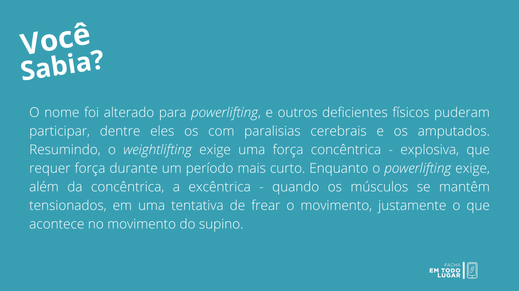 A modalidade praticada, exclusivamente, por atletas com deficiência segue as regras do World Para Powerfliting, vinculado ao Comitê Paralímpico Internacional (IPC). O exercício utilizado é o supino, no qual é possível que o praticante empurre uma carga até três vezes o seu peso corporal.
