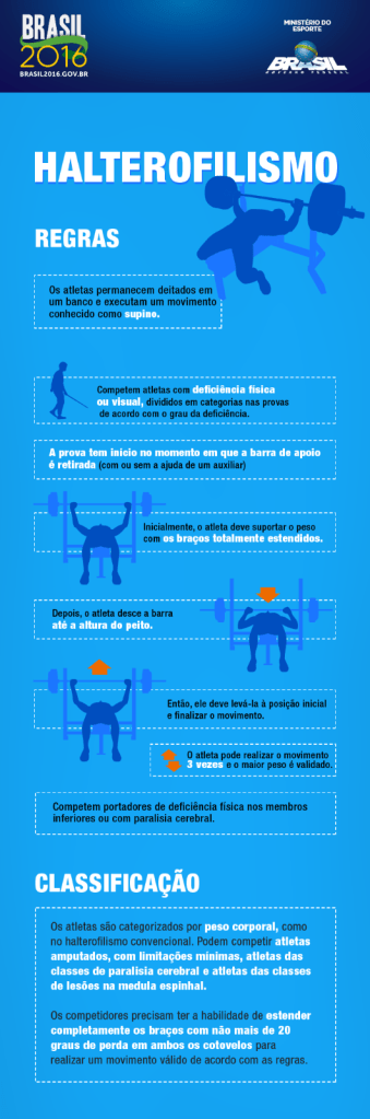 O halterofilismo paralímpico é uma modalidade esportiva que tem como objetivo testar a força de membros superiores de seus atletas. Difere da prática olímpica por trabalhar com a força máxima, ao invés de força explosiva. Parece não haver tanta mudança, mas o treinamento é, completamente, diferente em um e outro.