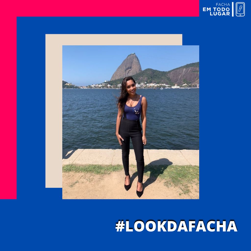 A aluna do curso de Jornalismo, Luiza Mendes, escolheu esse look para fazer o ensaio de fotos da formatura da faculdade. Ela usou o body da torcida da faculdade porque queria algo que a representasse nas fotos, querendo combiná-lo com uma peça preta e um salto alto preto.
