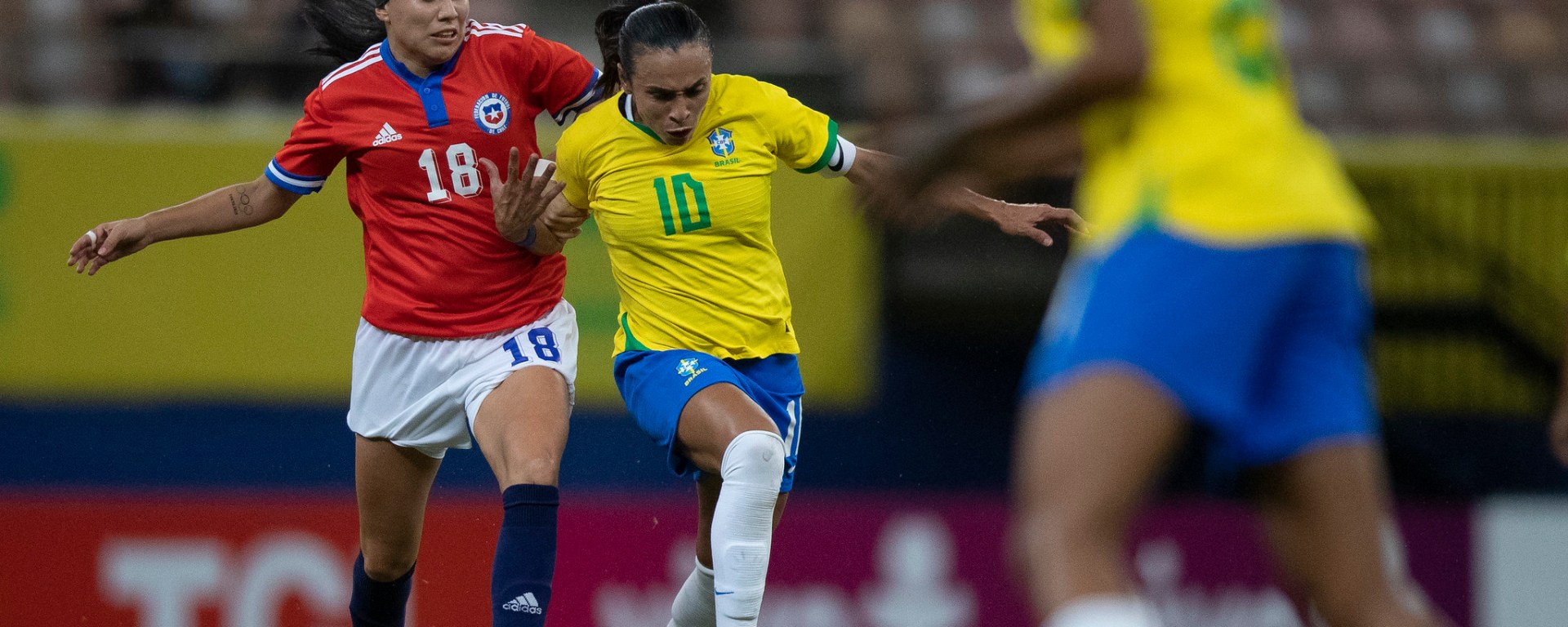 O primeiro tempo começou bastante equilibrado, com as duas equipes disputando chances de gol nos primeiros minutos, mas a brasileira começou a dominar a partida na metade da etapa. Com 3min de jogo, o Chile teve sua grande chance de gol com Uruttia chutando no alvo, mas Letícia defendeu com tranquilidade. Aos 33min, Marta cruzou para Antônia, que deixou o espaço para Debinha, mas o chute foi para fora.