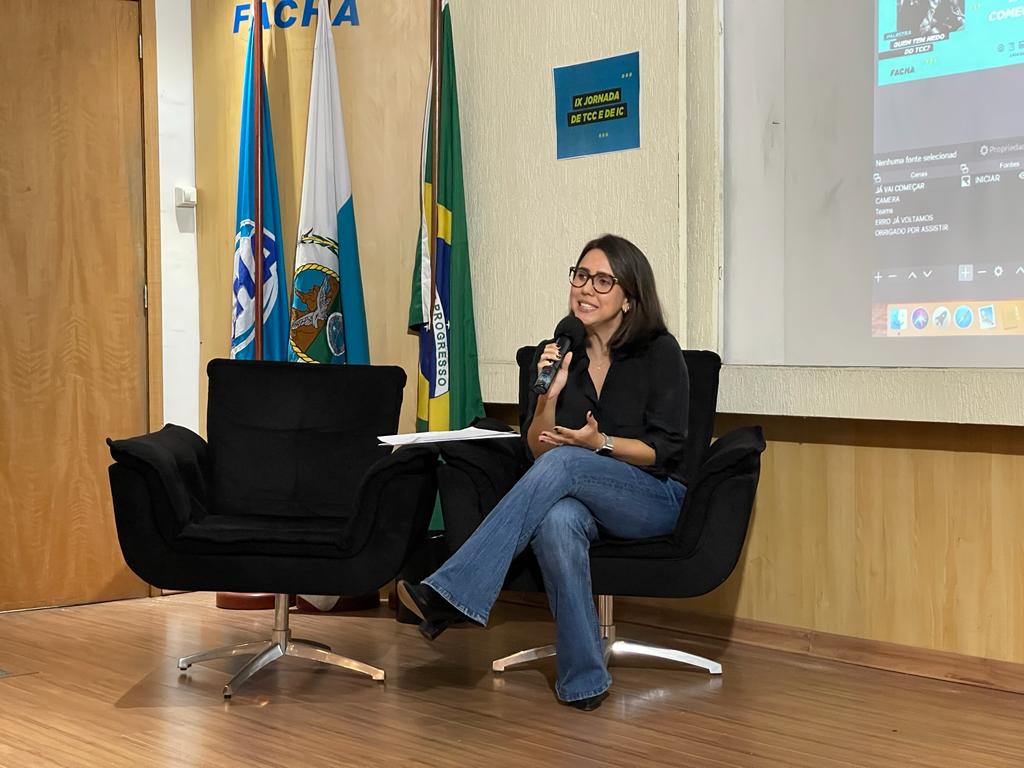 A professora de jornalismo da FACHA, Ana Paula Goulart, trouxe a perspectiva do problema da desinformação em todas as áreas como por exemplo direito, cinema e, principalmente, jornalismo.