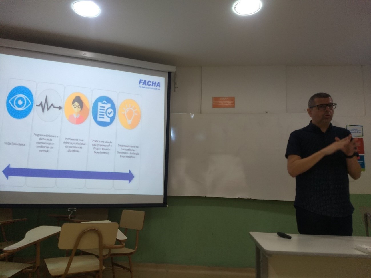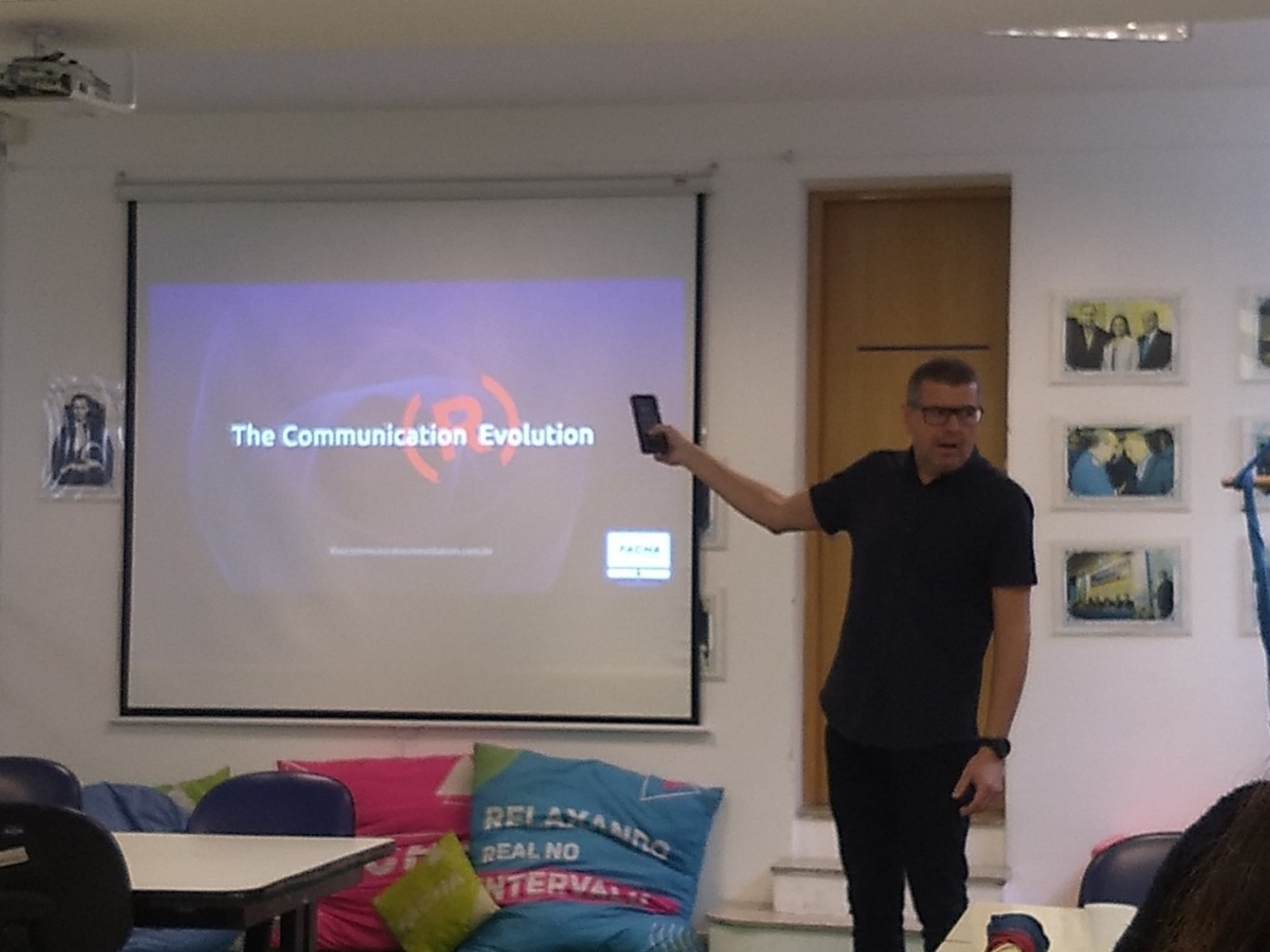 O coordenador dos cursos comentou sobre os benefícios do marketing para trazer produtos que podem ser úteis e benéficos na vida das pessoas. Ele lembrou que o marketing é muito atacado atualmente por conta de atitudes de empresas e pessoas, mas que não é exatamente isso. Durante a palestra, Bruno mostrou vídeos do projeto The Communication Revolution realizado pelo Grupo RBS em 2013 para exemplificar as transformações que a comunicação está passando. O coordenador falou para os alunos não terem medo de serem ousados e trazer novas ideias às empresas.
