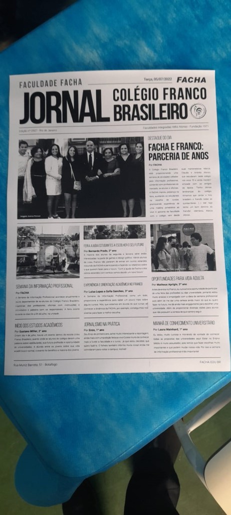 Finalizando o evento, os alunos e professores receberam o Jornal do Colégio Franco Brasileiro. As matérias foram feitas pelos alunos do Franco com o apoio dos estudantes das FACHA.