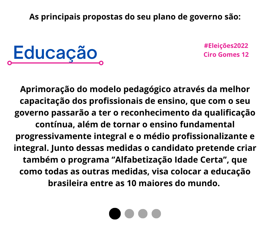 Ao todo o Brasil tem 11 candidatos à Presidência da República que já estão em campanha oficial, o Em todo Lugar juntou as principais propostas pronunciadas pelos candidatos em seus respectivos planos de governo para as seguintes áreas: Saúde, Educação, Mobilidade urbana e Segurança. Todas as proposições aqui apresentadas foram retiradas dos programas de governo depositados no TRE ou em declarações oficiais.