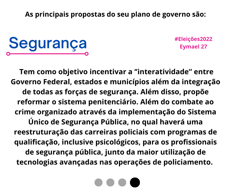 Segurança: O candidato traz o combate ao crime organizado e à corrupção, caso seja eleito. Dentre outras metas, a autonomia da PF, fim do foro privilegiado, controle de armas e munições.