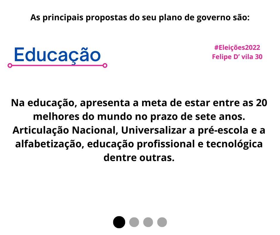Educação: Projeto de educação que dá ênfase no analfabetismo funcional, capacitação pedagógica e tecnológica. Além de melhorar a capacitação dos profissionais de educação e qualificação por meio de concurso público.