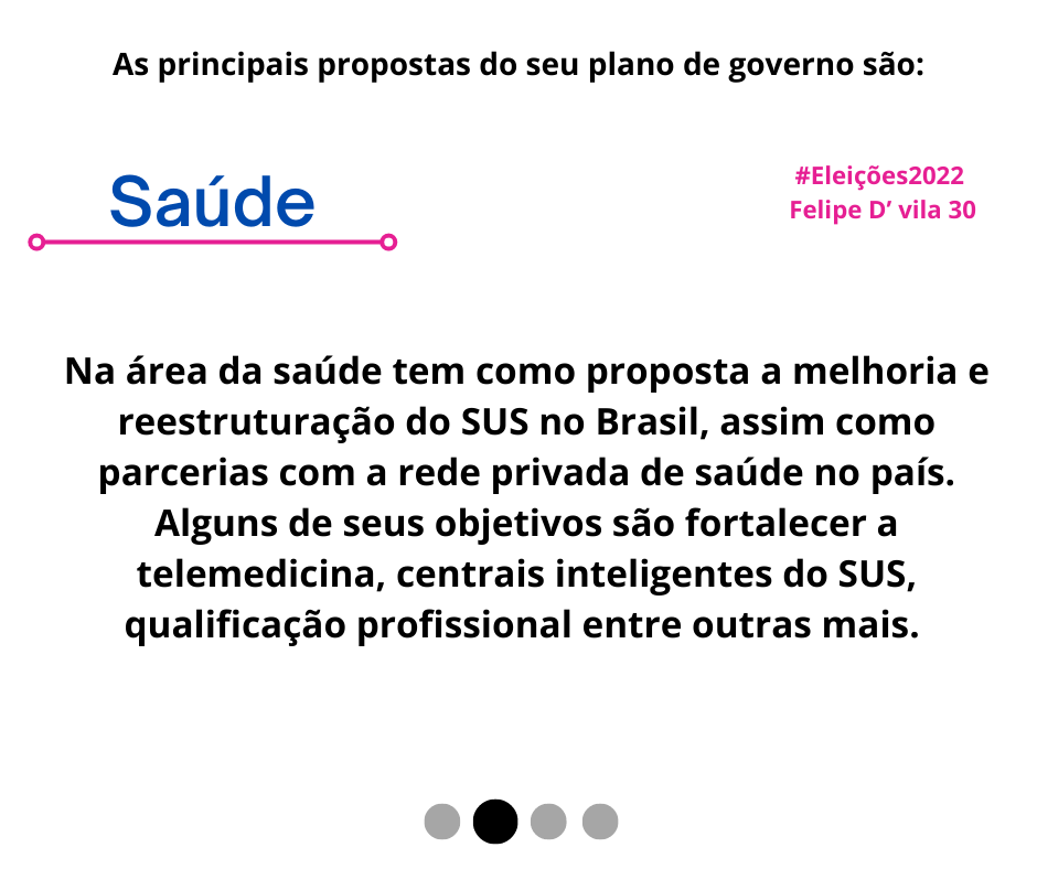 Saúde: Fortalecimento e modernização da atenção primária nos serviços públicos de saúde, além de diminuir as enormes filas de atendimento sobre diversas demandas, por meio de uma parceria com a rede privada. O candidato defende também a volta do programa Farmácia Popular e a volta da produção de medicamentos que no momento são importados.