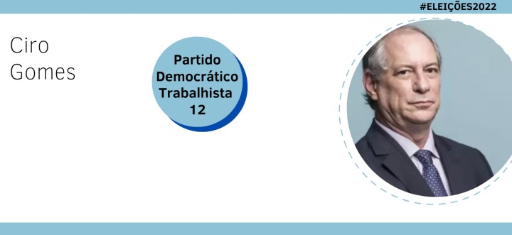 Ciro Gomes vive sua 4ª tentativa de assumir o cargo de presidente do país, já exerceu o cargo de prefeito de Fortaleza, ministro da fazenda no governo Itamar Franco e ministro da Integração Nacional no governo Lula. Representando o Partido Democrático Trabalhista, Ciro nomeia seu plano de governo como Projeto Nacional de Desenvolvimento (PND), defende uma retomada no crescimento econômico do País. Com uma consistente reforma tributária e fiscal, o candidato quer financiar seu projeto desenvolvimentista que busca estimular tanto o setor privado quanto o público, almejando o crescimento economicamente sustentável.