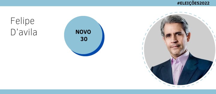 Representante pelo partido NOVO, o candidato Felipe D`Ávila, que já foi filiado ao PSDB, está concorrendo à presidência da República após a desistência de João Amoedo que concorreu em 2018 pelo NOVO, mas optou pela desistência neste ano.