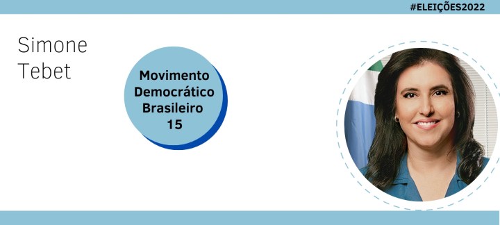 Simone Tebet candidata pelo partido MDB/ Federação PSDB Cidadania (PSDB, Cidadania) / PODE. Participantes da Coligação Brasil para Todos. A candidata é Senadora da República pelo estado do Mato Grosso do Sul.