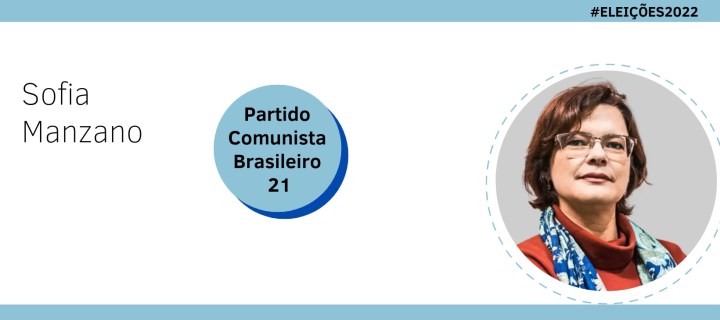 Sofia Manzano é candidata à Presidência da República pelo PCB. Doutora em História Econômica pela Universidade de São Paulo (USP), além de economista, também é professora universitária na Bahia. Em 2014, disputou a vice-presidência pelo PCB. Deu início à militância política pelo partido em 1989. A partir de 2013, passou a integrar o movimento sindical de professores, e foi uma das líderes de greves da categoria.