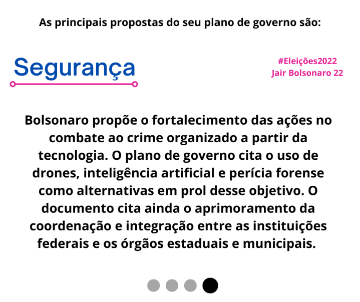 Segurança: Bolsonaro propõe o fortalecimento das ações no combate ao crime organizado a partir da tecnologia. O plano de governo cita o uso de drones, inteligência artificial e perícia forense como alternativas em prol desse objetivo. O documento cita ainda o aprimoramento da coordenação e integração entre as instituições federais e os órgãos estaduais e municipais.