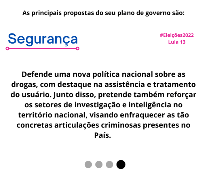 Segurança: Defende uma nova política nacional sobre as drogas, com destaque na assistência e tratamento do usuário. Junto disso, pretende também reforçar os setores de investigação e inteligência no território nacional, visando enfraquecer as tão concretas articulações criminosas presentes no País.