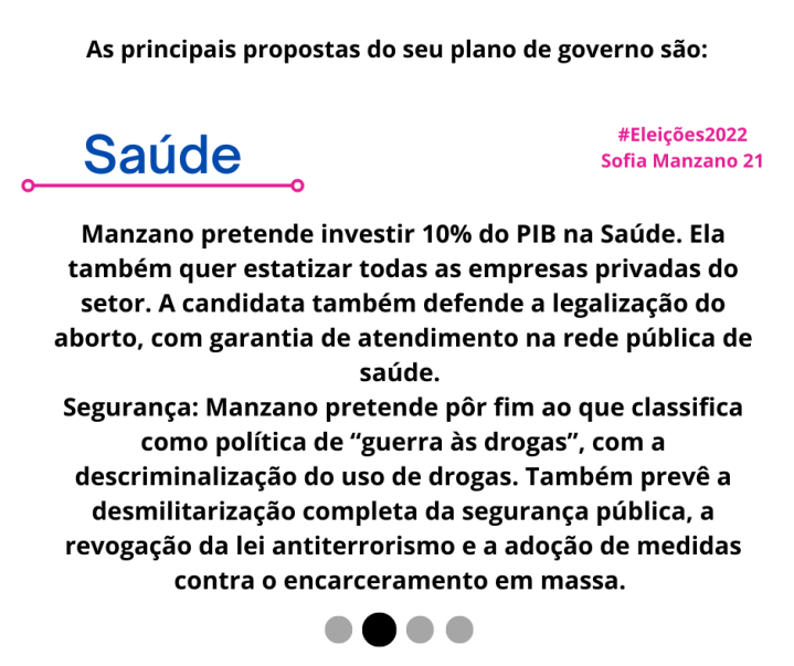 Saúde: Manzano pretende investir 10% do PIB na Saúde. Ela também quer estatizar todas as empresas privadas do setor. A candidata também defende a legalização do aborto, com garantia de atendimento na rede pública de saúde.