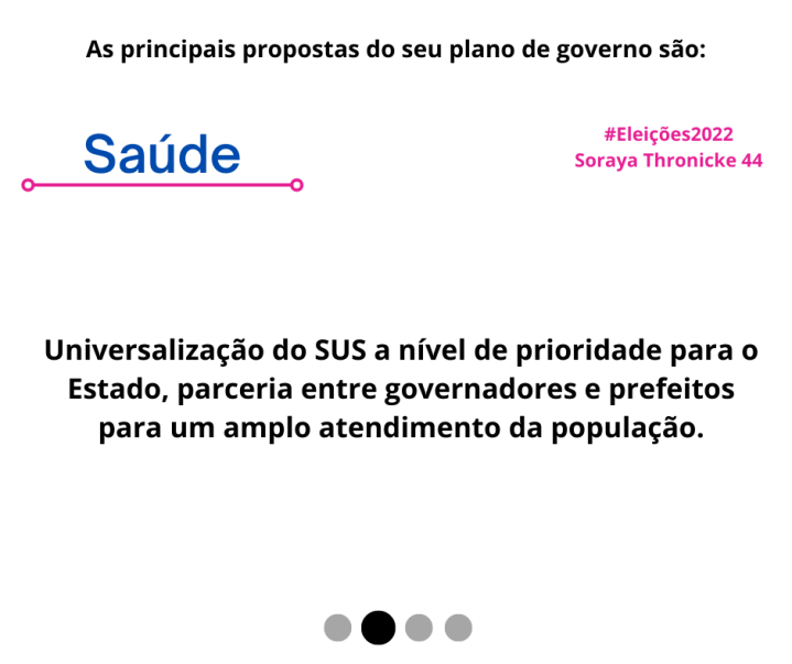 Educação: A Candidata tem propostas como: Reforma educacional para construção de um ensino 100% público, gratuito, laico, de qualidade e socialmente referenciado, da educação infantil à pós-graduação; Revogar Reforma do Ensino Médio e lei das escolas cívico-militares; Fim do vestibular, com criação de vagas correspondentes à demanda e destinação da maioria para alunos de escolas públicas, principalmente de baixa renda assim como recuperar e ampliar verbas do Fundeb e para universidades federais, para equipar e melhorar a qualidade e abrir novos campi no interior.
