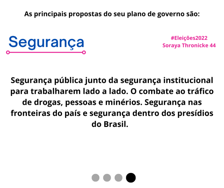 Segurança: A candidata deseja recriar o ministério da segurança pública para impedir o crime organizado e a entrada de drogas e armas no País, a fim de aplicar um governo inclusivo, seguro e transparente.