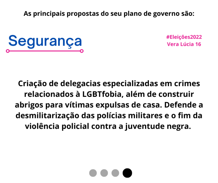 Segurança: Criação de delegacias especializadas em crimes relacionados à LGBTfobia, além de construir abrigos para vítimas expulsas de casa. Defende a desmilitarização das polícias militares e o fim da violência policial contra a juventude negra.