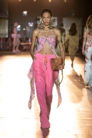 Veronica Etro trouxe para sua coleção um estilo dos anos 1980, inspiração do estilo boho, com estampa mesclando o patchwork com peças cut-out, fazendo jus ao nome Etro remix .