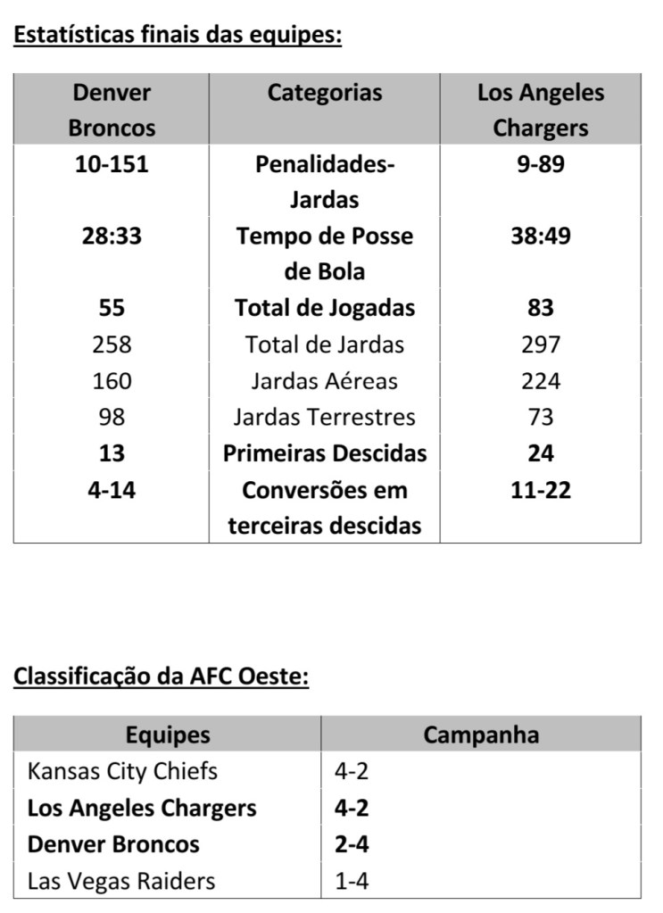 O Los Angeles Chargers perdia por 10 pontos, mas venceu de virada o Denver Broncos por 19×16 em confronto importante pela AFC Oeste, divisão na qual as equipes fazem parte. Apesar de Justin Herbet, quarterback dos Chargers, ter registrado 57 tentativas de passe para 238 jardas e uma interceptação, e seu running back Austin Ekeler ter sido o principal alvo, anotando 83 jardas totais (47 vindas através do passe e 36 de corridas), a performance da equipe mandante foi marcada pelas longas campanhas com muitas conversões de terceiras descidas, que não só impossibilitaram que Denver tivesse mais tempo de posse de bola para realizar jogadas, mas foram finalizadas em pontuações a partir de field goals (chute que, quando convertido, vale três pontos) e touchdowns (jogada de pontuação máxima; quando a equipe chega à zona final do campo).