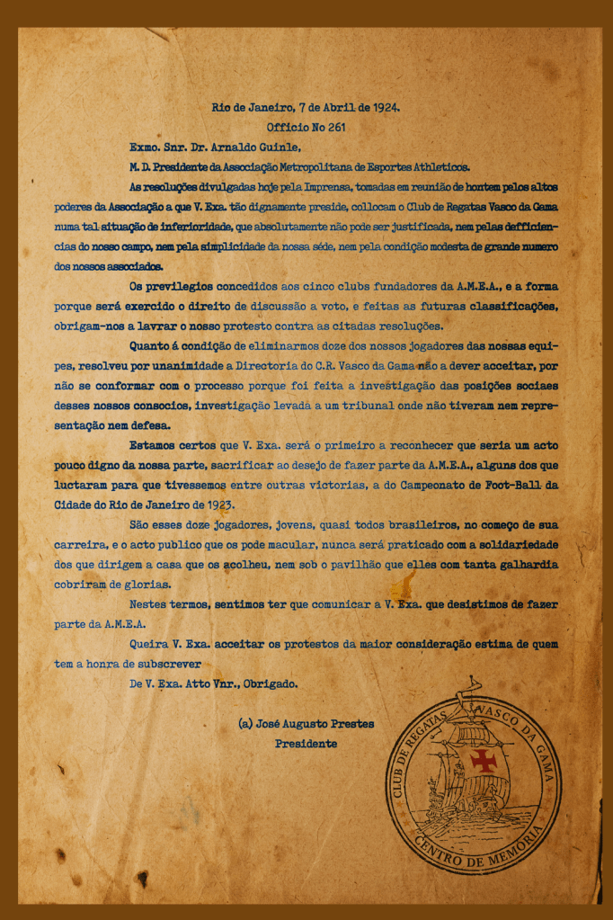 As resoluções divulgadas hoje pela Imprensa, tomadas em reunião de hontem pelos altos poderes da Associação a que V. Exa. tão dignamente preside, collocam o Club de Regatas Vasco da Gama numa tal situação de inferioridade, que absolutamente não pode ser justificada, nem pelas defficiencias do nosso campo, nem pela simplicidade da nossa séde, nem pela condição modesta de grande numero dos nossos associados.