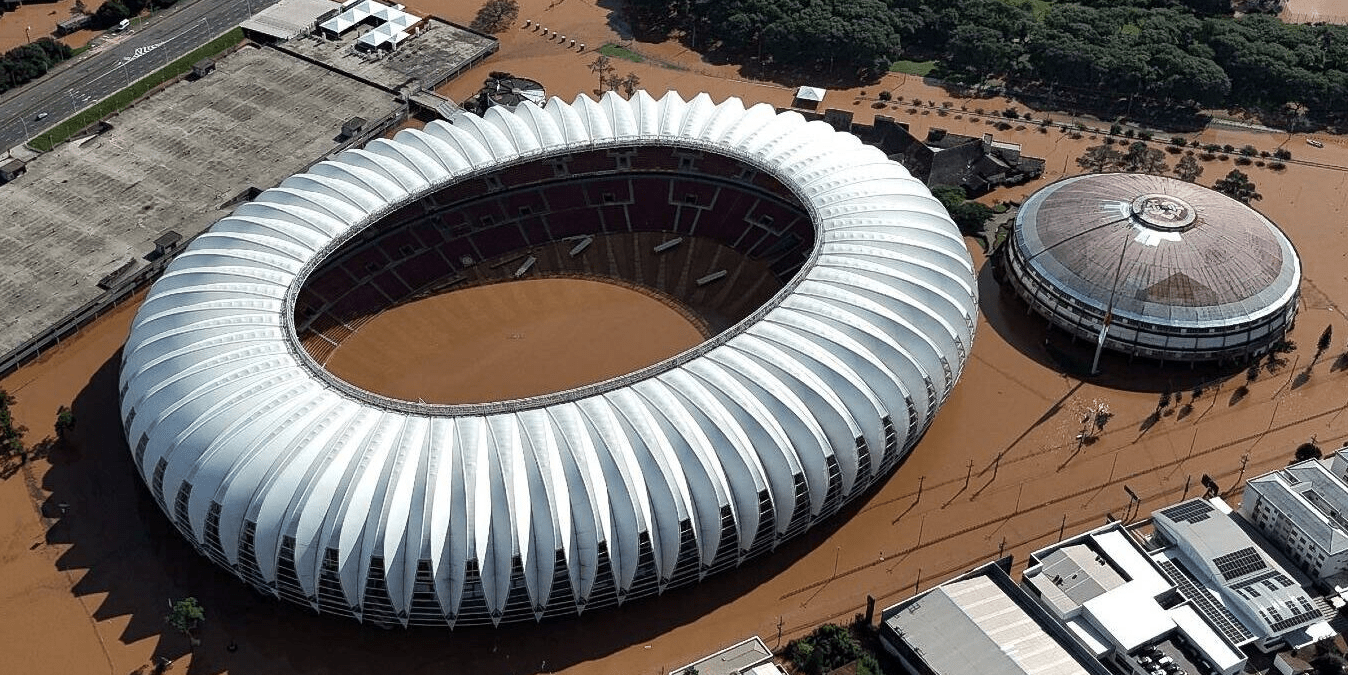 Legenda: Na foto: Vista aérea do estádio do Internacional (Beira-Rio) inundado devido às fortes chuvas no Rio Grande do Sul, no dia 7 de maio de 2024. Foto de capa/Divulgação: Istoé esportes.