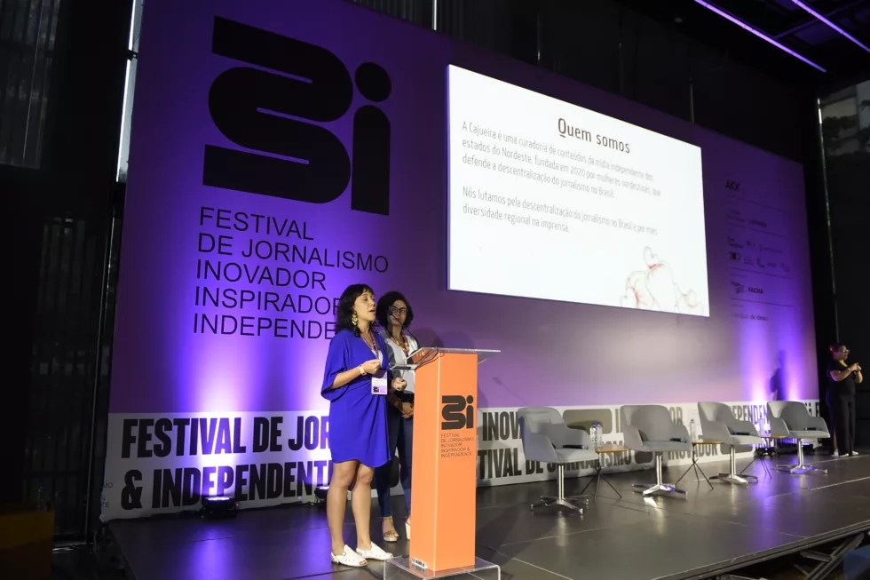 As cofundadoras destacaram todos os recursos que são disponibilizados pela Cajueira para promover essa descentralização: a newsletter quinzenal, o CajuZap, e a Rede Cajueira, que conta com o primeiro banco de dados de fontes nordestinas no Brasil, com foco em diversificação e descentralização.
