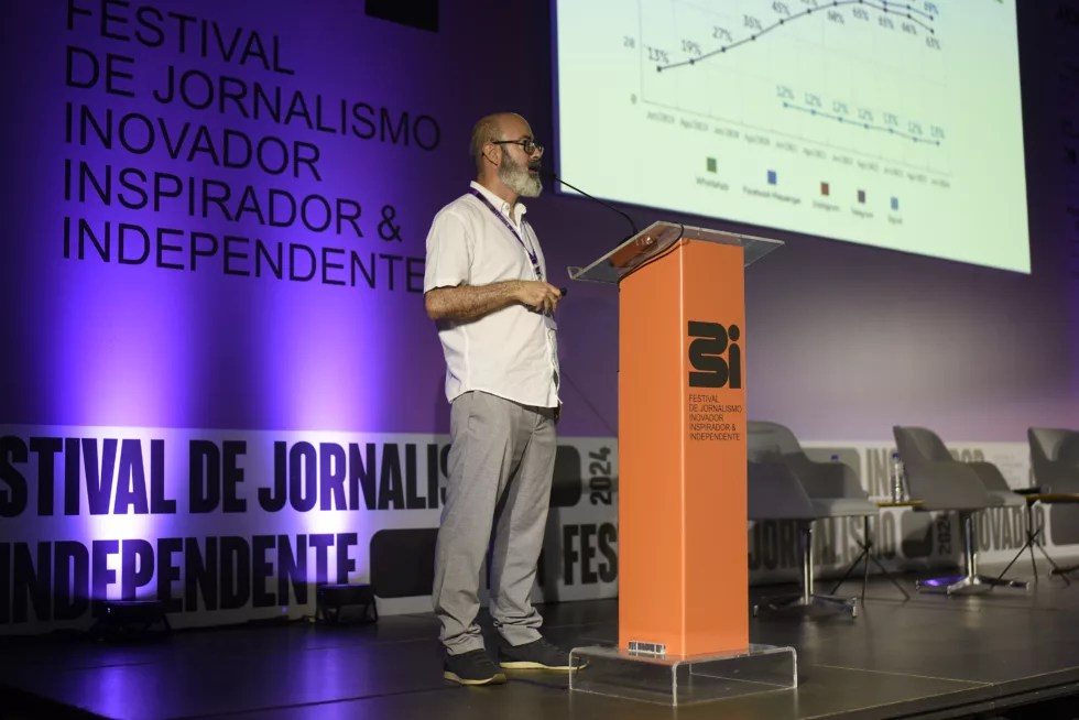Sérgio Spagnuolo, diretor-executivo do Núcleo Jornalismo, trouxe ao Festival 3i o pioneirismo do veículo ao publicar uma política aberta de uso de inteligência artificial na redação, mantendo a ética, a transparência e alinhamento à política editorial como objetivo principal.