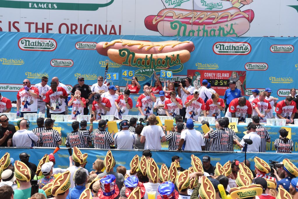 “Nathan’s Famous Fourth of July Hot Dog Eating Contest”, realizado anualmente no Coney Island, Nova York, é uma das competições mais conhecidas. Os participantes competem para ver quem consegue comer mais cachorros-quentes em 10 minutos.
