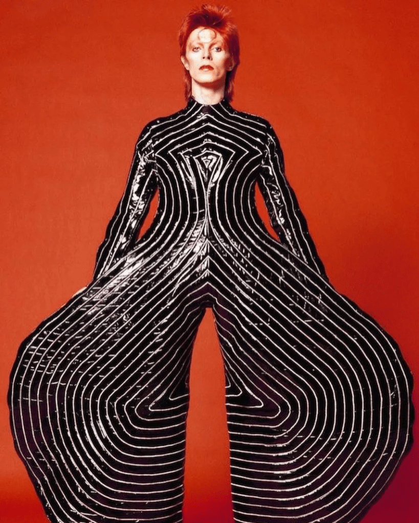 Um dos maiores ícones dessa época foi David Bowie. Com seu alter ego Ziggy Stardust, Bowie desafiou as normas de gênero e estilo, misturando roupas extravagantes, maquiagem marcante e perucas coloridas, criando uma figura que ainda hoje é associada à quebra de barreiras entre o rock, a moda e a identidade. Seu visual influenciou toda uma geração de fãs e artistas, tornando-se um símbolo de individualidade e inovação. O icônico raio vermelho e azul desenhado em seu olho, foi desenhado pelo designer de maquiagem Pierre Laroche e representava a divisão que Bowie sentiu naqueles anos onde sua popularidade aumentou e ele finalmente conseguiria conquistar os Estados Unidos e o mundo