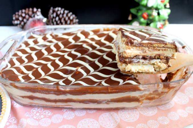 Faça uma camada de creme branco, uma de biscoitos champagne molhados no leite, uma de creme de chocolate, outra de biscoito e uma de chocolate branco. Deixe um pouco de creme de chocolate para decorar. Sirva gelado
