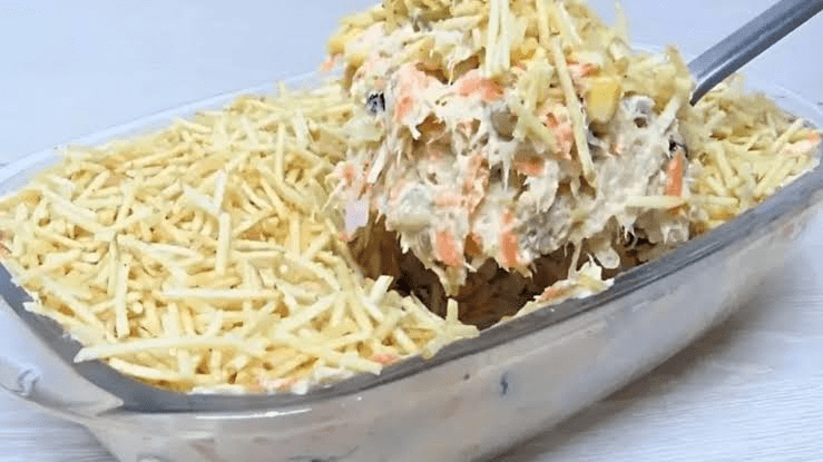 Misture todos os ingredientes, menos a batata palha. Depois de tudo misturado, forre com a batata palha.