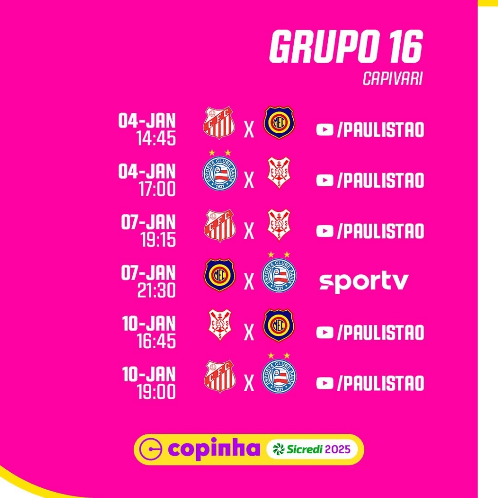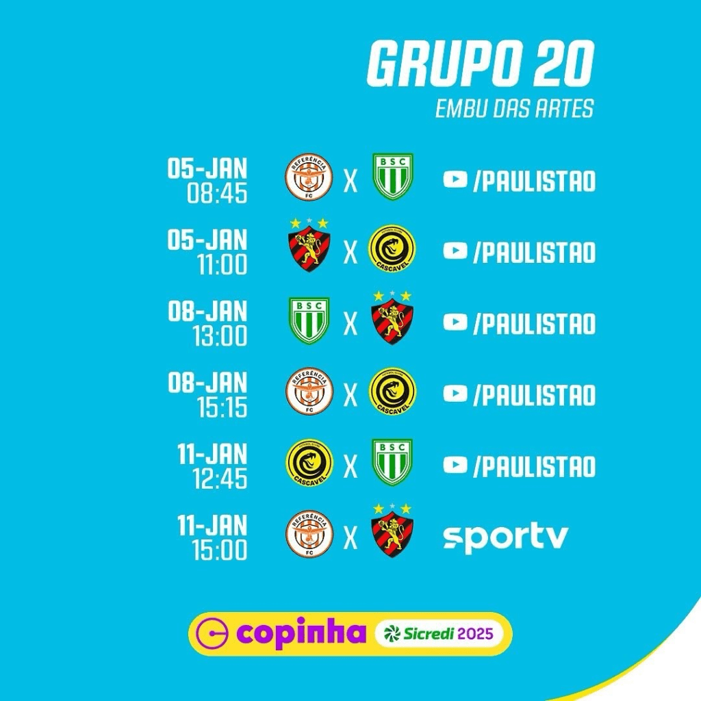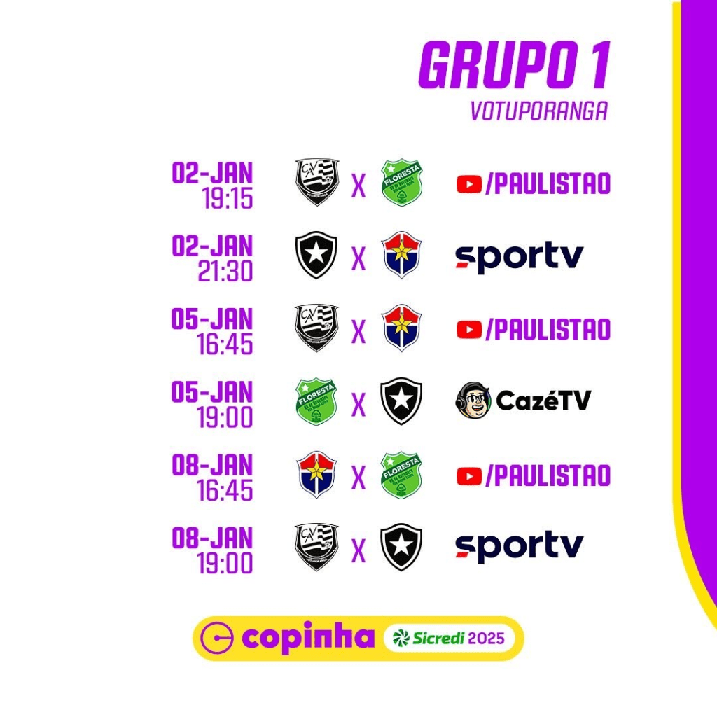 No grupo 20, o Boavista enfrenta o Cascavel-PR, o Referência-SP e o Sport-RE. O time, que não competia desde 2019, viaja com força máxima. Com a chegada da SAF recentemente, o clube está investindo ainda mais em infraestrutura. O técnico Leandro Miranda, que retornou ao Verdão de Saquarema neste ano, acredita que as novas transformações podem ajudar o desempenho da equipe na Copinha.