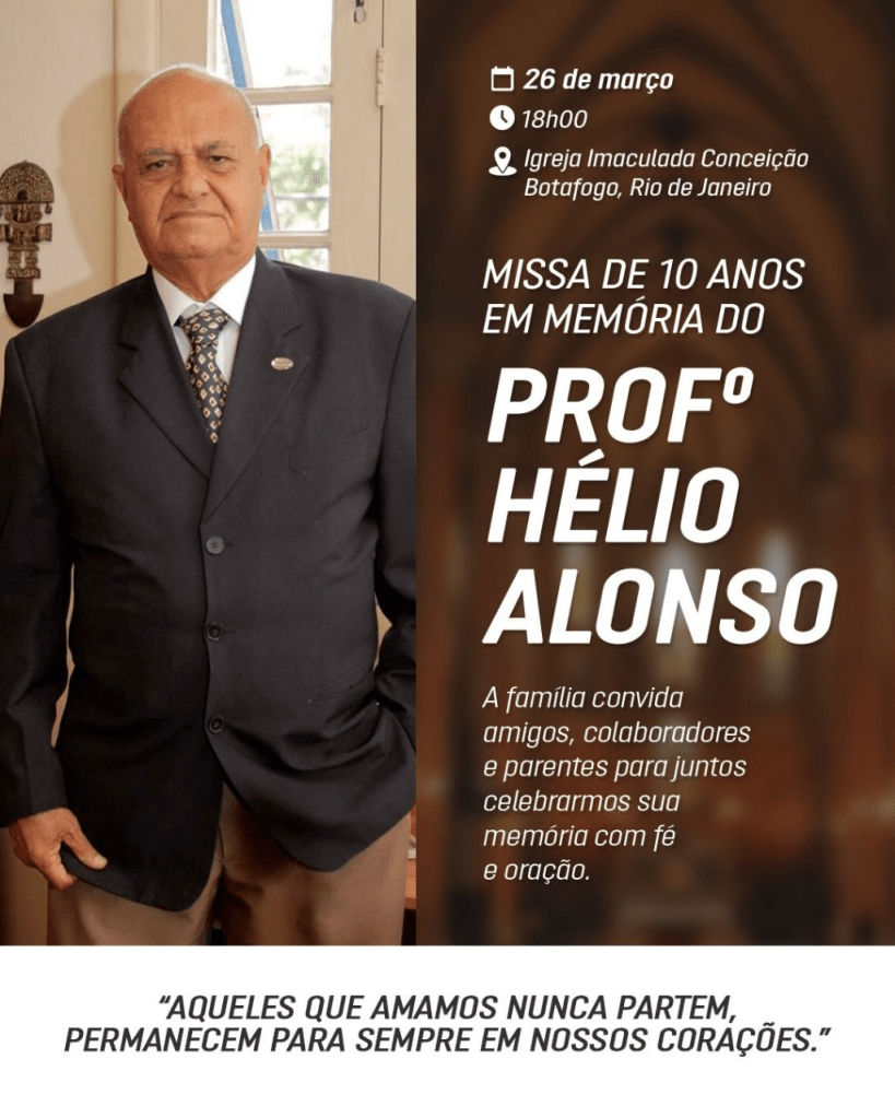 A Missa de 10 anos do Prof. Hélio Alonso será em 26/03, às 18h, na Igreja Imaculada Conceição (RJ). Familiares e amigos estão convidados para a homenagem.
