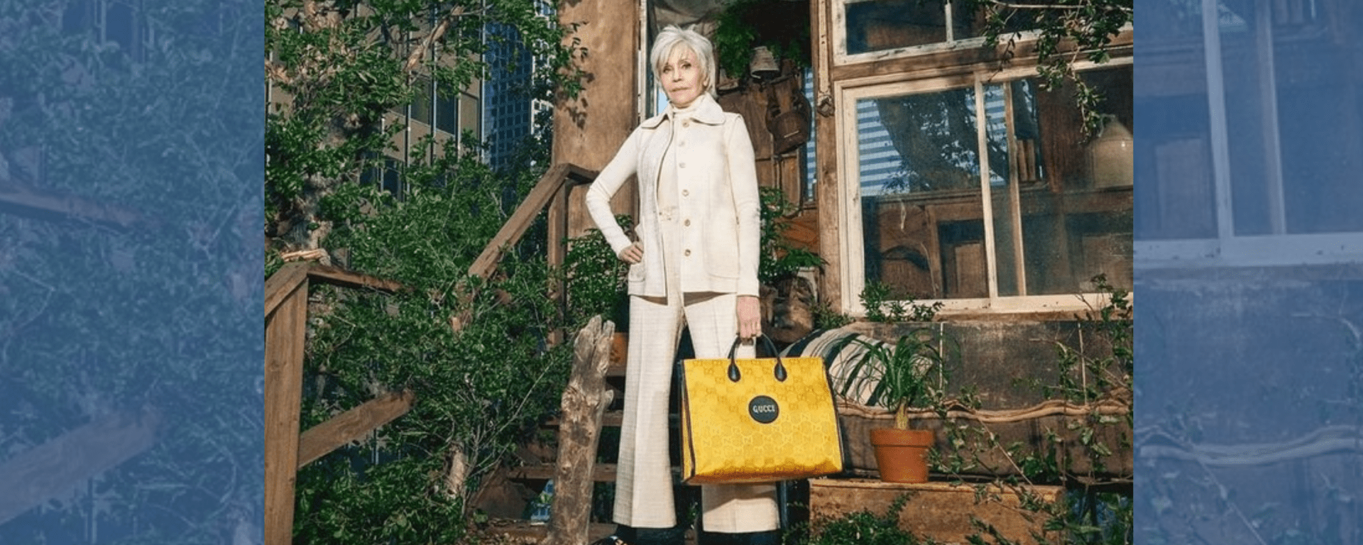 Jane Fonda é um dos nomes que estrela a campanha da nova coleção da Gucci feita de materiais recicláveis. Créditos: Reprodução/Gucci/Instagram